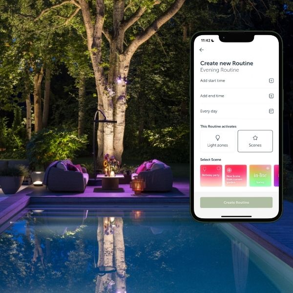 With the in-lite app, you can make your outdoor lighting smarter than ever. Use Routines to set timers so your lights automatically turn on at sunset and off at sunrise. This way, your garden is always perfectly illuminated without you having to lift a finger. Dark corners and hard-to-see areas disappear, making your garden not only more atmospheric but also less inviting to unwanted visitors.