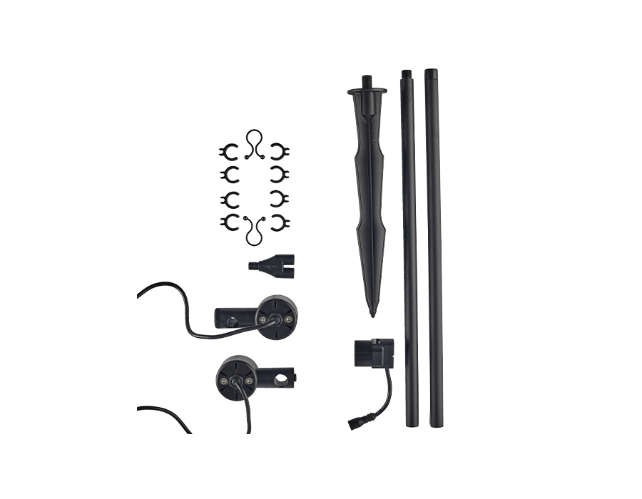 Installez sur une surface dure en utilisant le support ou dans un sol meuble avec le piquet de sol inclus. Regardez les vidéos d'instructions sur la page des conseils d'installation pour plus d'informations sur l'installation du système in-lite.