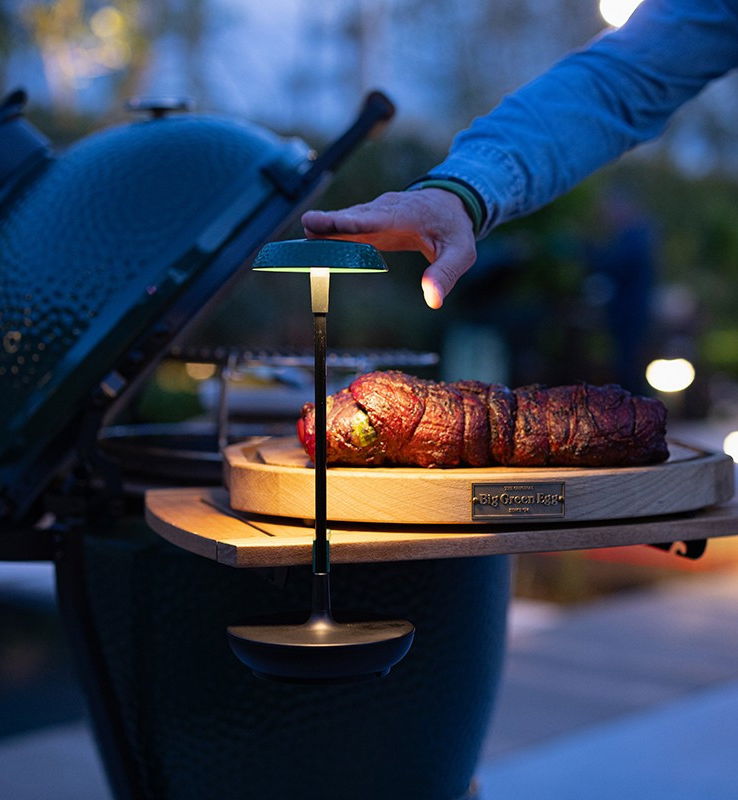 SWAY TABLE Big Green Egg edition is een draadloos en draagbaar armatuur met het iconische uiterlijk van de Big Green Egg. Dankzij het bijpassende ontwerp kun je hem gemakkelijk naast je Big Green Egg plaatsen of erop monteren. SWAY TABLE is oplaadbaar via USB en heeft een extreem lange batterijduur van wel 60 uur, zodat je je geen zorgen hoeft te maken dat het licht uitgaat tijdens je slow cooking sessies.